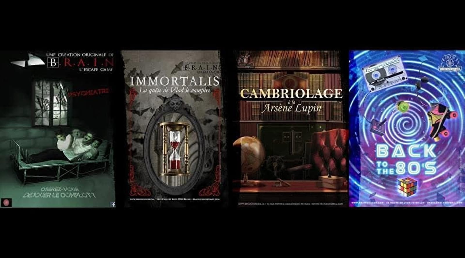 With friends or family, form your team and experience an immersive adventure like no other! You've got 60 minutes to solve the riddles and escape. Four adventures with original scenarios and settings are available: Psychiatric, Vampire, Arsène Lupin-style burglary and Back to the 80's.