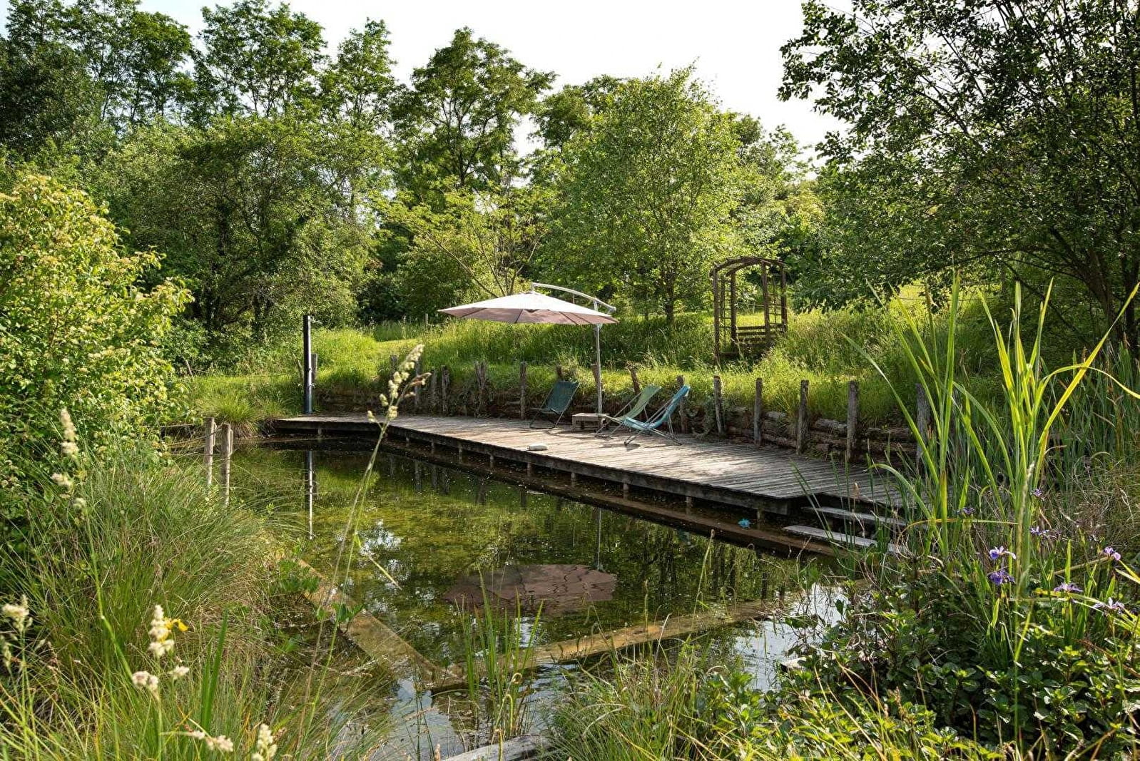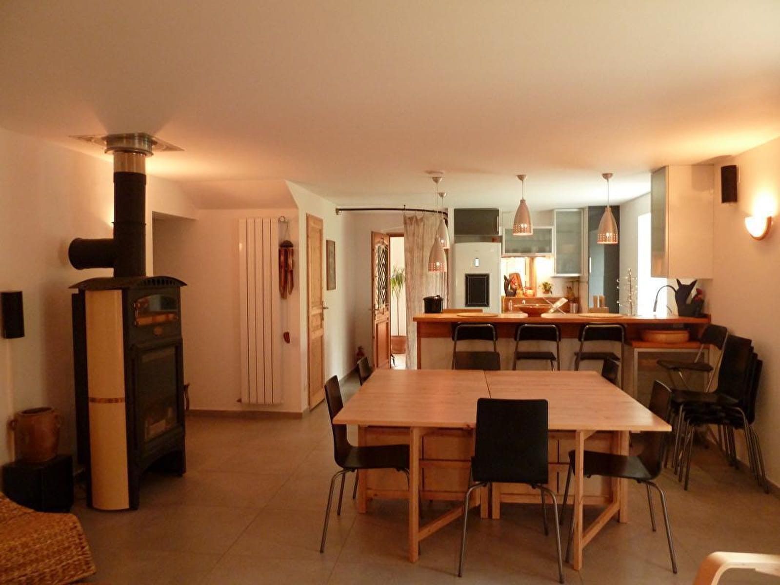 Composition: Detached house next to another building (including wellness room, yoga room and reception) and the owners' house (total independence without vis-à-vis). Wireless. Solar central heating + wood stove. Ground floor: living room-kitchen-lounge (TV / video projector, piano), 2 bedrooms (double bed 140x190cm / 2 single beds 90x200cm) including 1 with private multi-jet hammam shower, bathroom (multi-jet shower ), Separate toilet. 1st floor: second living room-kitchen (dining area, PC office), 2 bedrooms (double bed 140x190cm / 4 single beds 90x200cm including 2 bunk beds), bathroom (balneotherapy bath, shower, WC). 2nd floor: mezzanine bedroom (2 single beds 90x200cm). Private terrace + small garden (ping-pong table). Parking + local bicycles + private electric car charging socket. Common land 7 ha. Natural swimming area (shared). Shops & services 11 km.