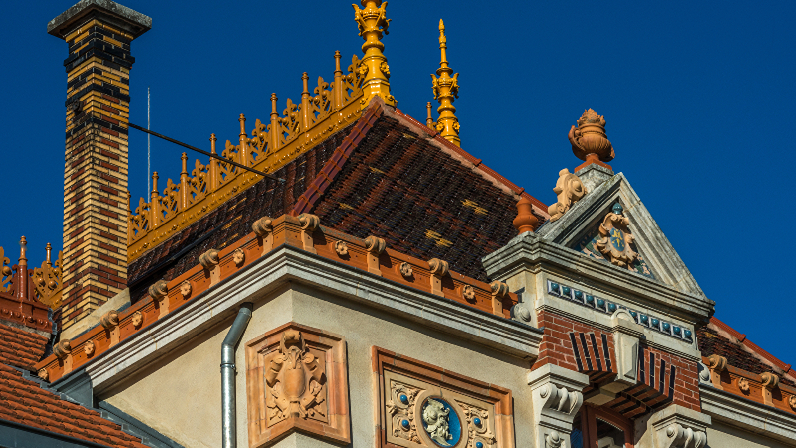 This Belle Epoque-style pavilion was used as a show house for the owner of the ceramics factory in Ecuisses. The façades decorated in a wide range of decorative styles are incredible, still today.