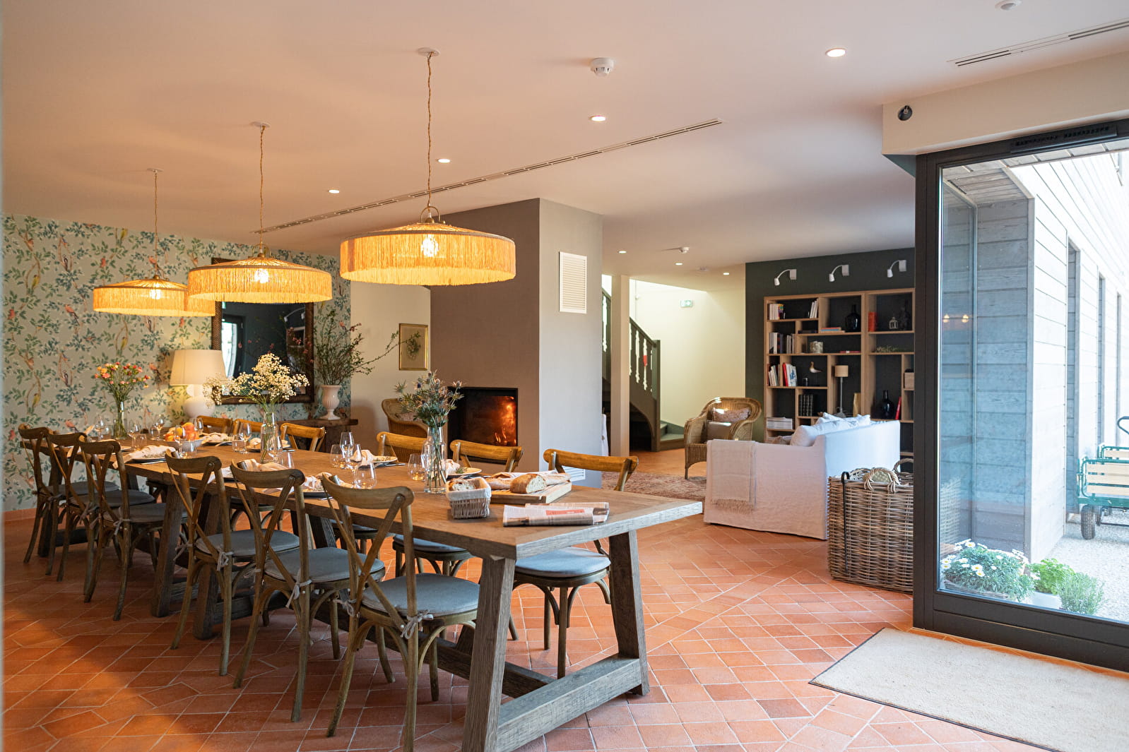 On the ground floor, you'll find everything you need to share convivial moments: a kitchen with its central island opening onto the living room, a large dining table seating 20, and a sitting area with armchairs and sofas. At the centre of the house is the fireplace, which brings warmth and cosiness in cold weather.