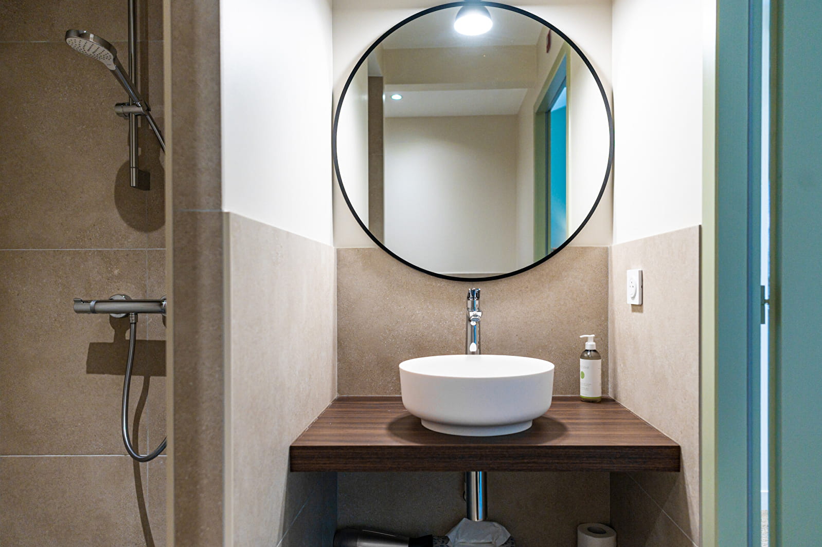 - 1 ground-floor flat fully adapted for people with reduced mobility, with its own bathroom. It comprises a bedroom with 1 double bed, 1 bedroom with 2 separate beds and a sitting area with a sofa bed.