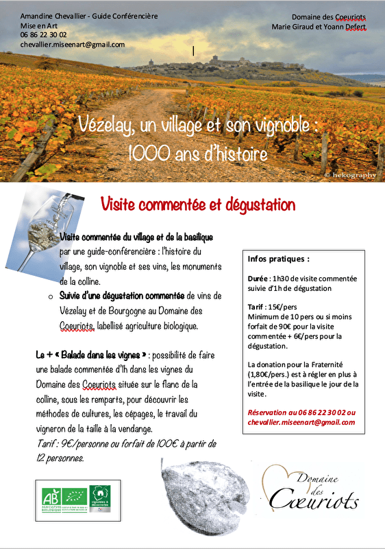 Want to combine heritage discovery with wine tasting? Follow the guide! Amandine will tell you all about the history of the village of Vézelay, perched on the eternal hill, with or without a visit to the basilica, depending on your wishes. You'll discover the incredible history of this spiritual Mecca, the beauty of its Romanesque houses and the charm of its narrow streets. Amandine will then introduce you to the world of Vézelay wines with a guided tasting at a local winery.
